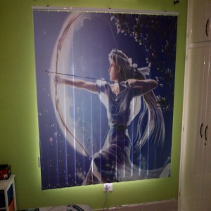 Vertical picture blinds have the slats running vertically down. When the slats are tilted to a closed position, the full picture can be seen. The slats are made up of a vinyl material which provides a blockout effect when closed. The picture faces the inside of the room area and plain while it faces the exterior.